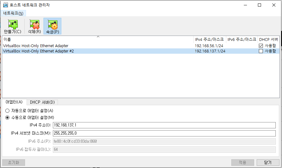 어댑터 1에 호스트 전용 어댑터 / VirtualBox Host-Only Enthernet Adapter로 설정