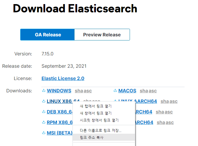 - https://www.elastic.co/kr/downloads/elasticsearch ์ ์ํด์ LINUX X86_64 ๋งํฌ ์ฃผ์ ๋ณต์ฌ ํด๋ฆญ