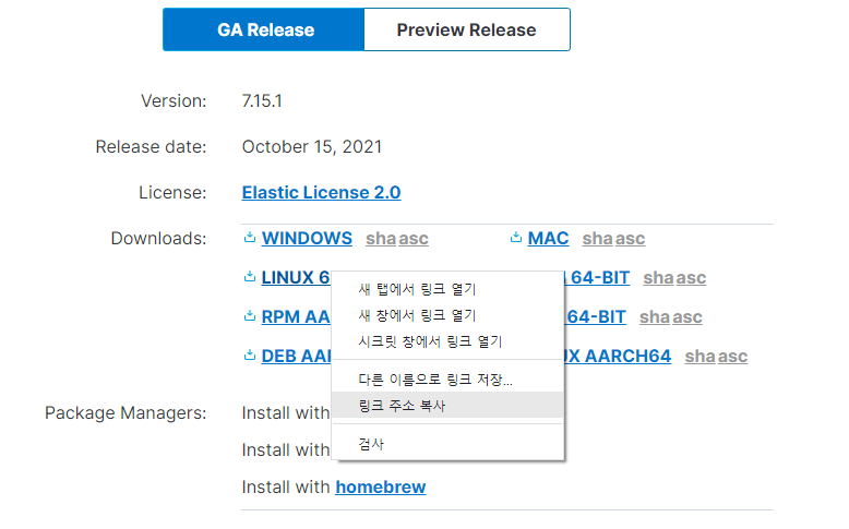 - https://www.elastic.co/kr/downloads/kibana ์ ์ํด์ LINUX 64-BIT ๋งํฌ ์ฃผ์ ๋ณต์ฌ ํด๋ฆญ